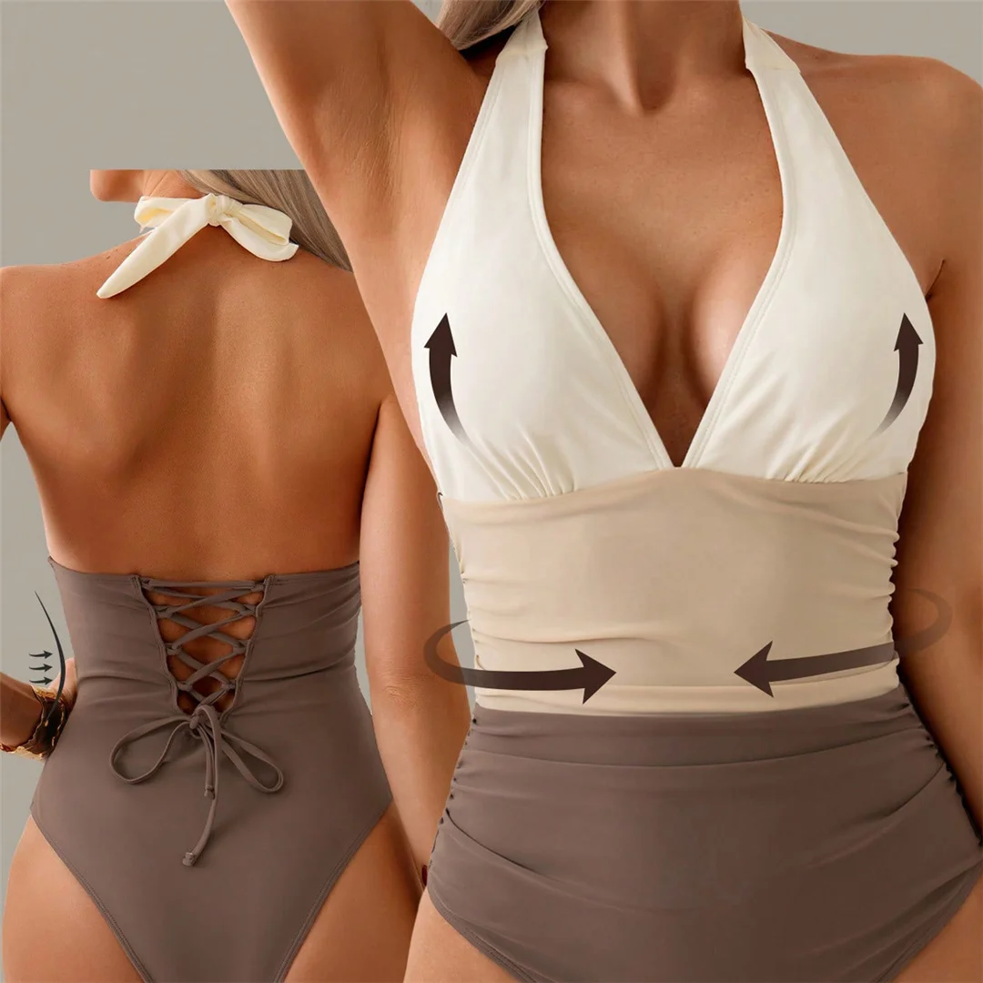 Designed for women who value sophistication and confidence, the Sculpt Luxe Contour Swimsuit is the perfect balance of elegance and performance. Featuring a flattering halter neckline and a high-waisted silhouette, this piece is crafted to enhance natural curves while delivering a sculpted, refined look. The contrast panel design highlights the waist, creating a beautifully defined and feminine shape.